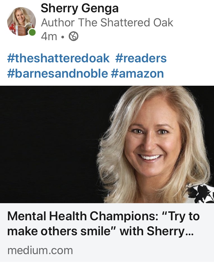 As I described in the book, The Shattered Oak, the victim was a recipient of domestic abuse from her husband. She took solace under the strong oak tree in her front yard. As she sunk further into mental illness, the oak too became distress and ill. In Barbara’s case she was lucky by surviving three suicide attempts. As we know some aren’t so lucky. I think most of us do occasionally struggle with depression but most filter it back out and let it go. Sometimes struggling makes us a stronger and gives us perspective to let go of our past and absorb our mistakes along the way. Most of us struggle with self-worth issues, but normally we rise to the occasion and succeeded. Depression can intervene in the thought process and cause us to focus on the negative. Psychologists continually try to understand why a person’s negative view of their situation outweighs their desire to live. Clinical studies have shown that stressful situations can actually bring on a form of mental illness where the person is not totally in control of their decisions. For the families of those victims many questions go unanswered.
