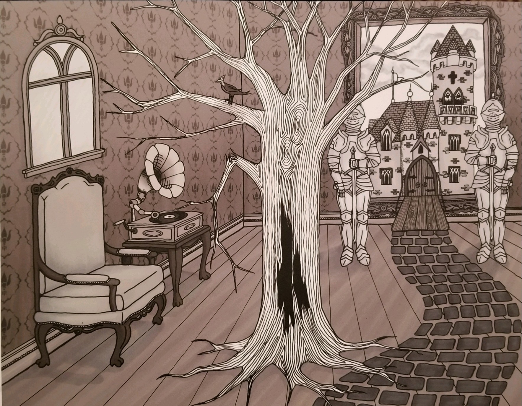 Alice’s office was a small room with a brown leather couch, two fluffy red pillows with rich silk curtains draped around a window and a painting of a castle on the wall. A built-in book case traveled the length of the room. Alice’s chair was strategically placed in front of a small rounded antique window. In her office, lying on her couch, I always felt like I was stepping into that gold elegant picture frame with a gray castle from medieval times. It depicted two large men in shinny armor suits holding their swords protecting the large wooden doors of this stone castle. Like my dying oak tree that gives me solace, I feel protected when I entered this room.